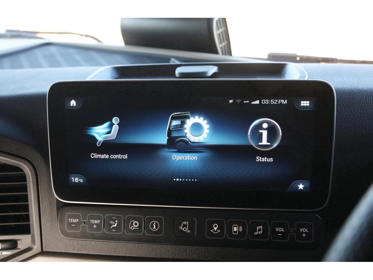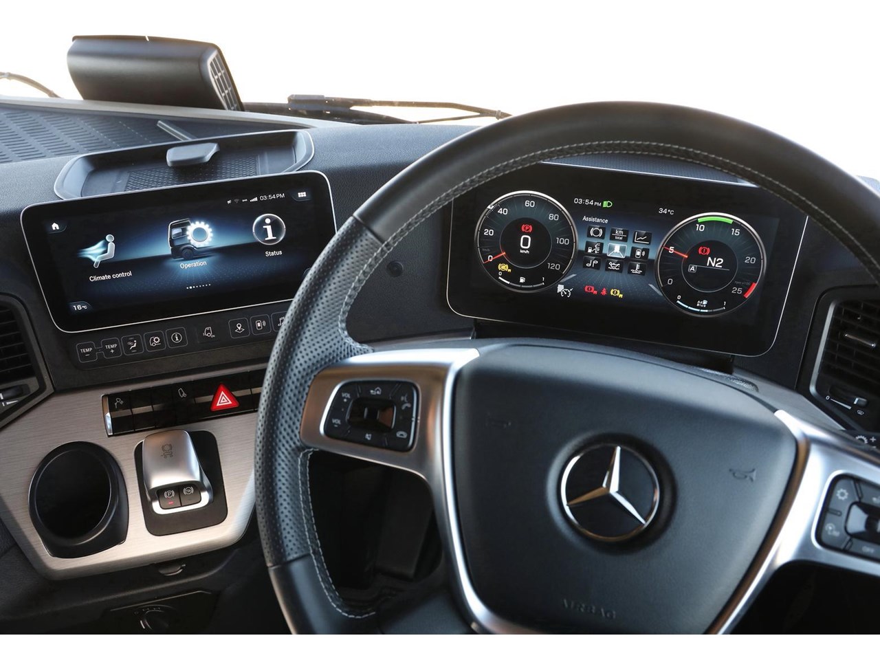 Cabin - Kerb mirror and main mirror, manoeuvring setting, co-driver's side - Driver and co-driver sunblind - Seat belt monitor - Air horns, cab roof - Air deflector, snap-in, with cab side deflectors - Sun visor exterior transparent with chrome highlight - TrendLine interior design with ambient lighting, chrome trim, carpet on engine tunnel - Leather steering wheel - Driver and co-driver air sprung comfort leather suspension seat - Luxury bed, bottom, inner spring - Luxury bed, top, wide, with levelling control - Multimedia Cockpit, interactive - Comfort telephony, wireless charging - Cruise control and speed limiter - Travel computer, on-board diagnosis and maintenance system - Truck navigation - DAB radio - Premium loudspeaker system with additional speakers - 24 V/15 A co-driver footwell sockets - Automatic climate control - Pull out tray table on passenger side - Stowage flap and compartments above windscreen - Stowage compartment exterior flap, left and right - Mercedes star, illuminated from behind in dark chrome - Dark chrome badging - Two 30 l pull-out refrigerators under bunk